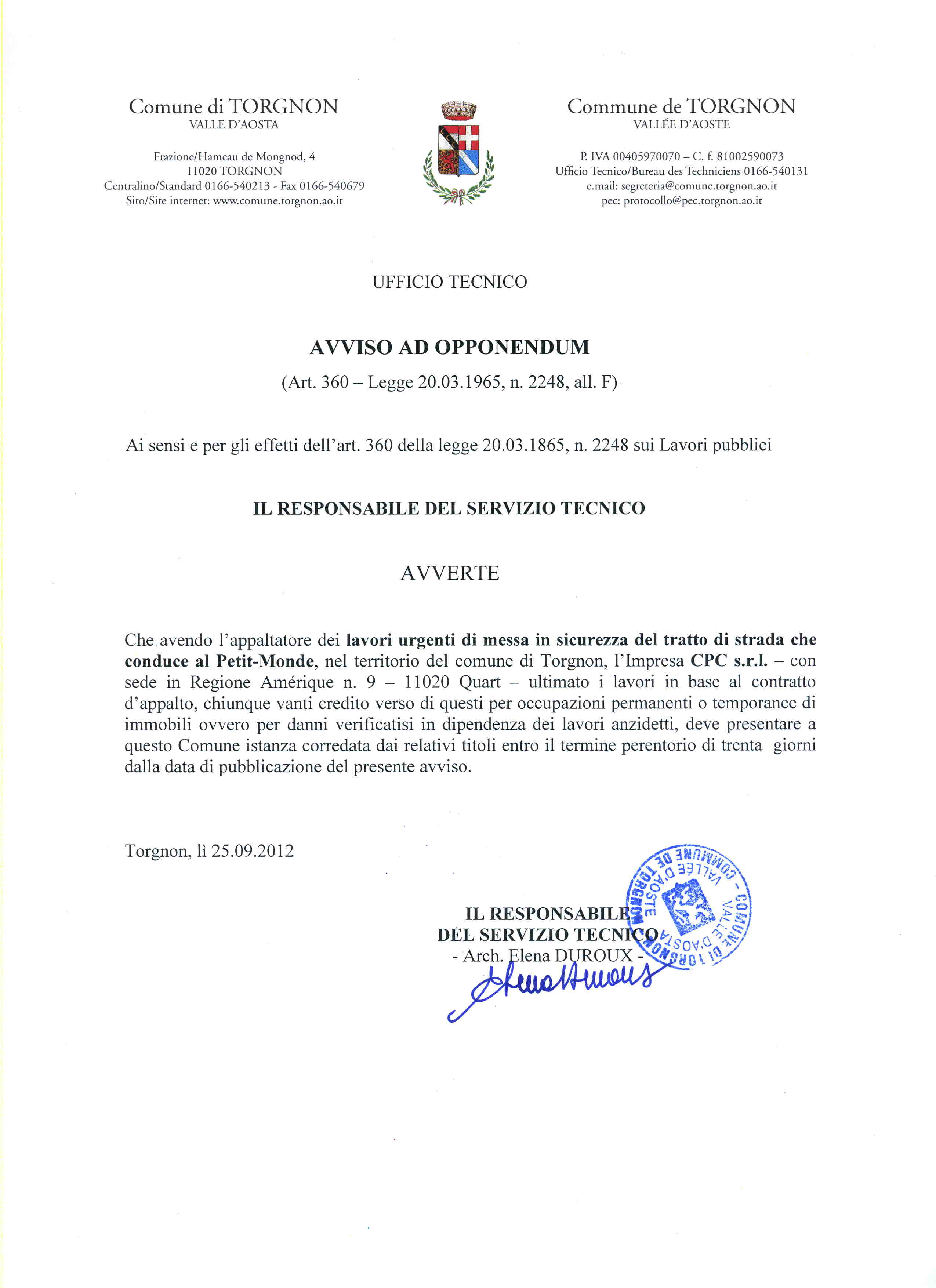 Messa in sicurezza strada Petit Monde - Avviso ad opponendum