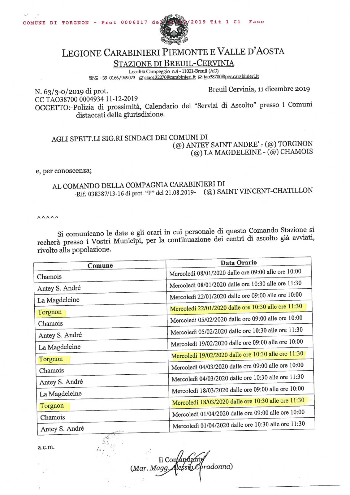 istituzione di Centri di Ascolto presso le sedi dei Comuni di Antey-Saint-André, Chamois, La Magdeleine e Torgnon.