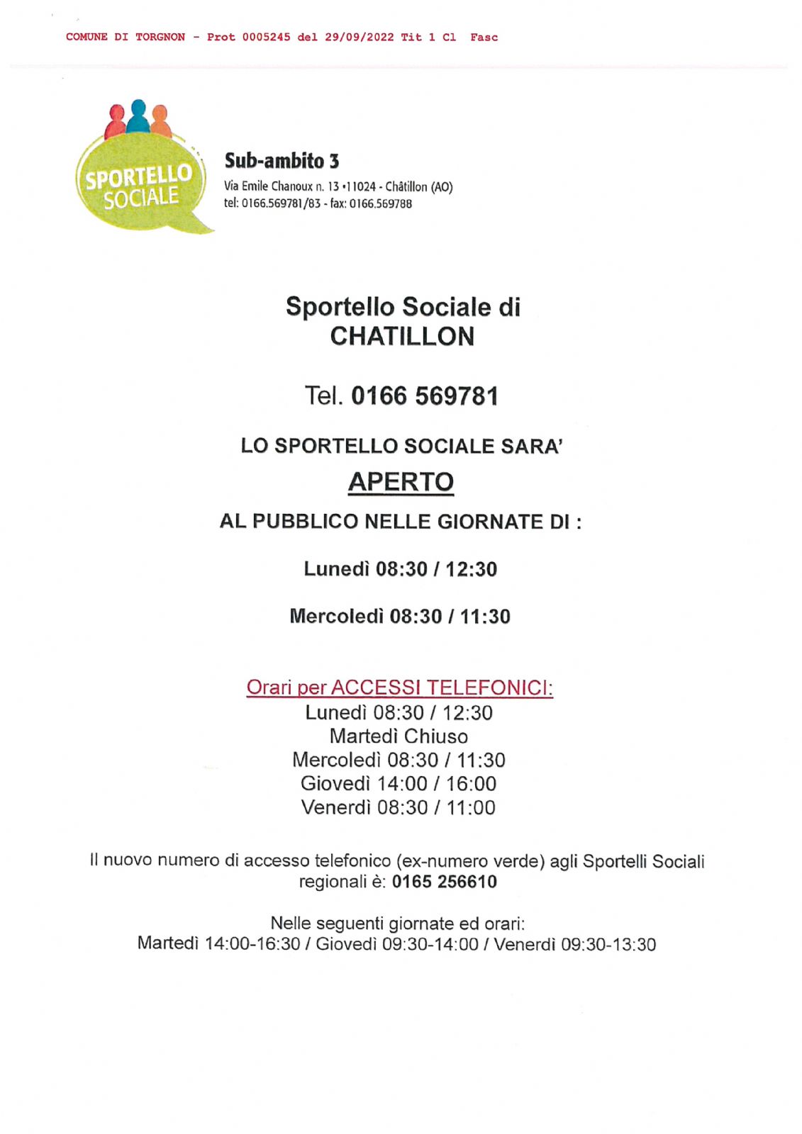 ORARI DI APERTURA SPORTELLO SOCIALE DI CHATILLON