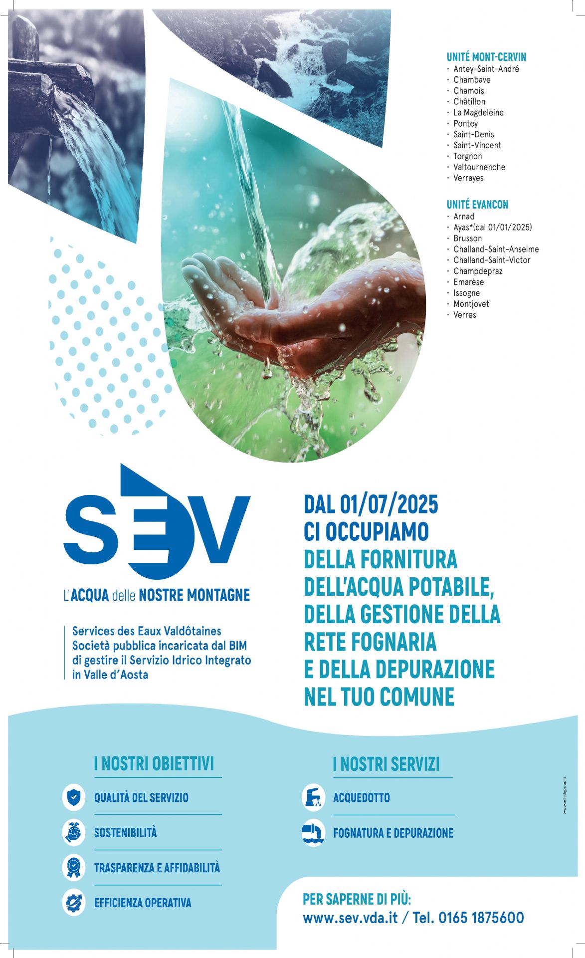La società Services des Eaux Valdôtaines (SEV) è subentrata a partire dal 1° luglio 2025 nella gestione del servizio idrico integrato, che pertanto non è più in carico al comune.
