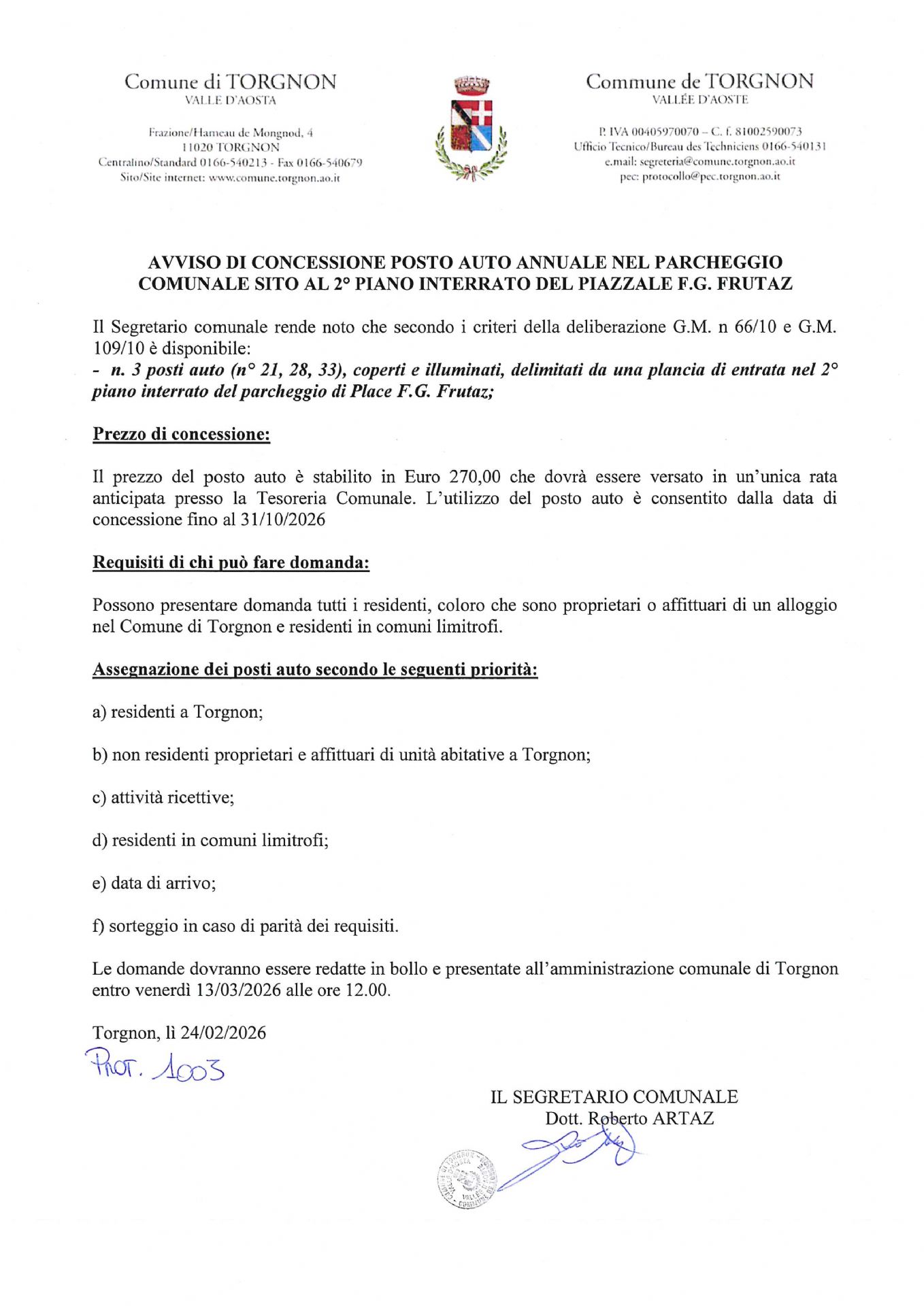 Avviso di concessione di n. 3 posti auto (n° 21, 28, 33) nel 2° piano del parcheggio comunale di Place Frutaz. La concessione sarà valida fino al 31/10/2026 al costo di euro 270,00.