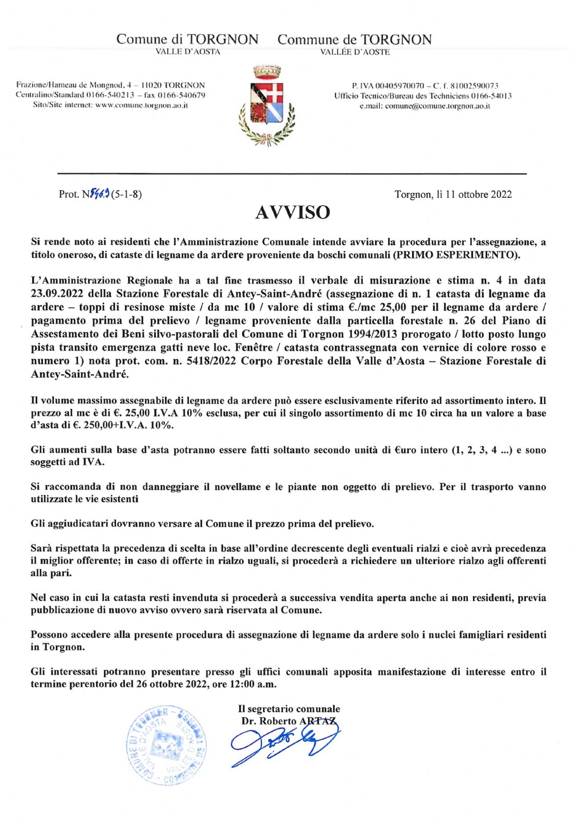 Avviso per l'assegnazione, a titolo oneroso, di cataste di legname da ardere proveniente da boschi comunali. (1° esperimento)