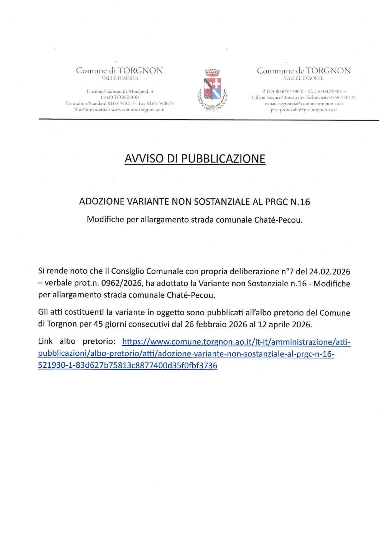 Si rende noto che il Consiglio Comunale con propria deliberazione n°7 del 24.02.2026 – verbale prot. n. 0962/2026, ha adottato la Variante non Sostanziale n.16 - Modifiche per allargamento strada comunale Chaté-Pecou.