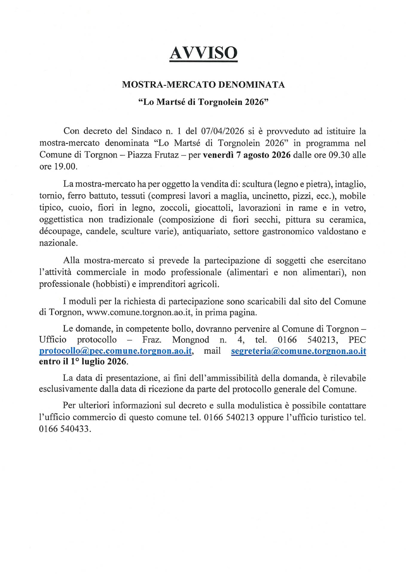 Con decreto del Sindaco n. 1 del 07/04/2026 si è provveduto ad istituire la mostra-mercato denominata "Lo Martsé di Torgnolein 2026" in programma nel Comune di Torgnon, piazza Frutaz, per venerdì 7 agosto 2026 dalle ore 09.30 alle ore 19.00.