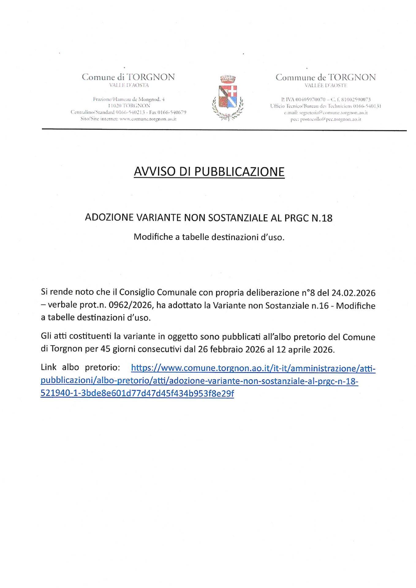Gli atti costituenti la variante in oggetto sono pubblicati all’albo pretorio del Comune di Torgnon per 45 giorni consecutivi dal 26 febbraio 2026 al 12 aprile 2026.